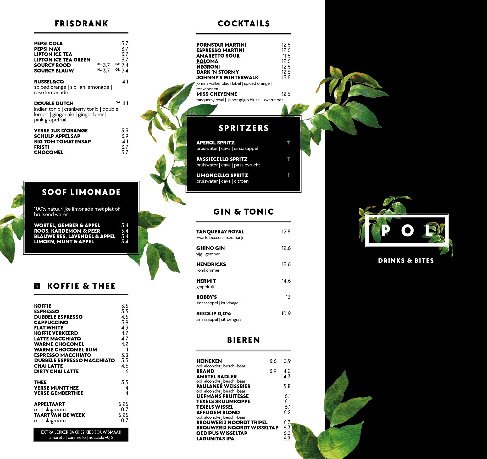 Bij POL maak je van elke borrel een feestje! Geniet van onze selectie mooie wijnen, cocktails, gin-tonics en bieren. Combineer je drankje met onze heerlijke borrelhapjes, snacks en frites, of ga voor een royaal borrelplateau om te delen.