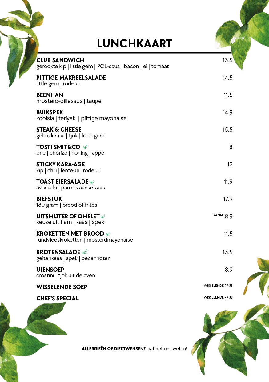 We willen niet opscheppen, maar onze keuken staat bekend om de lekkerste broodjes van de Meent. Denk bijvoorbeeld aan het broodje POL, onze clubsandwich of Aziatisch buikspek. De vegetarische lunchgerechten zijn ook om je vingers bij af te likken. Kan je niet kiezen? Dan is het plankje keuzestress iets voor jou.